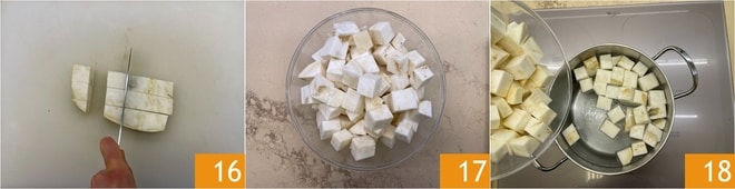 Schneiden Sie sie in Würfel 16 und sammeln Sie sie nach und nach in einer Schüssel 17. Wenn das Wasser zu kochen beginnt, geben Sie die Selleriewürfel hinein und kochen Sie sie 10 Minuten lang 18.