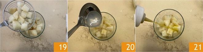 Gießen Sie die Selleriewürfel ab und geben Sie sie in ein hohes, schmales Gefäß 19. Fügen Sie eine Kelle Kochwasser und etwas Öl hinzu 21.