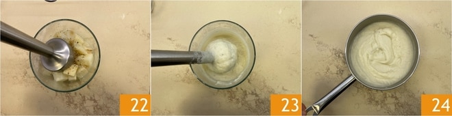 Würzen Sie mit Salz, Pfeffer und pürieren Sie alles mit einem Stabmixer 22, bis Sie eine glatte Creme erhalten 23. Geben Sie das Püree dann in einen kleinen Topf 24 und halten Sie es warm.