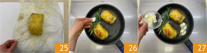 Nach 30 Minuten nehmen Sie den Kapaun aus dem Ofen und entfernen Sie Küchengarn und Backpapier 25. Legen Sie ihn in eine heiße Pfanne mit einem Schuss Öl und braten Sie ihn gut an. Fügen Sie dann Rosmarin und Knoblauch hinzu 26 und die Butter 27.