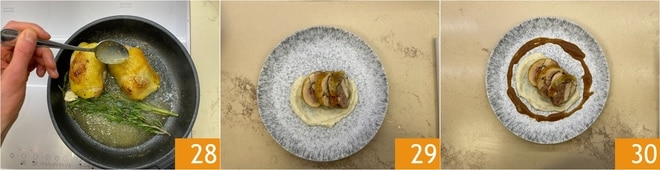 Verwenden Sie die schmelzende Butter, um den Kapaun zu begießen und zu würzen 28. Wenn er gut angebraten ist, schalten Sie das Feuer aus und servieren Sie ihn. Platzieren Sie das Selleriepüree unten, dann den Kapaun in Scheiben 29 und zuletzt den heißen braunen Fond 30.