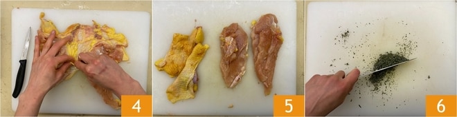 Trennen Sie die Haut von der Brust 4 und teilen Sie die Brust in zwei Hälften 5. Hacken Sie Rosmarin, Thymian und Salbei 6.