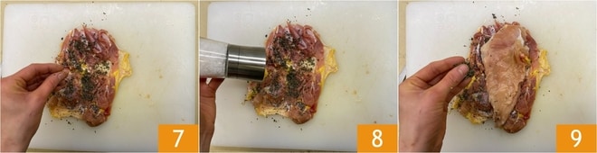 Legen Sie die entbeinte Keule auf ein Schneidebrett und würzen Sie sie mit etwas aromatischem Hack 7, Salz 8 und Pfeffer. Legen Sie die Brust darauf 9 und fügen Sie nochmals Hack, Salz und Pfeffer hinzu.