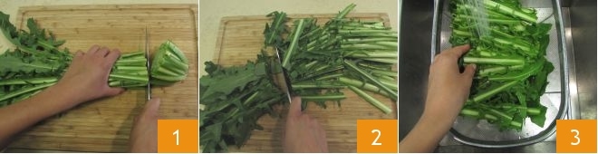 Um die Rolls mit Grana Padano und Gemüse zuzubereiten, bereiten Sie zuerst den Löwenzahn vor: Entfernen Sie das Ende der Stiele 1, schneiden Sie ihn in 3 Teile 2 und waschen Sie ihn unter fließendem Wasser 3.