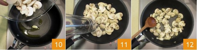 In einer Pfanne braten Sie eine Knoblauchzehe mit etwas Öl an, dann fügen Sie die Pilze hinzu 10, salzen und pfeffern Sie 11 und kochen Sie bei mittlerer Hitze für etwa 5 Minuten, danach lassen Sie sie abkühlen.