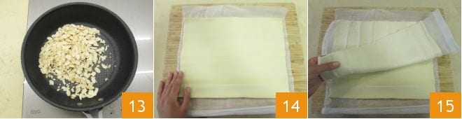 Rösten Sie schließlich die Mandeln in einer heißen Pfanne etwa 3 Minuten, achten Sie darauf, dass sie nicht verbrennen 13. Nun können Sie beginnen, die Zutaten zusammenzusetzen: Rollen Sie den Blätterteig auf der Arbeitsfläche aus 14, dann rollen Sie den Pizzateig darauf aus, sodass sie übereinanderliegen 15.