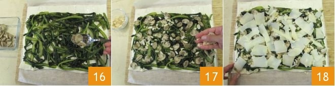 Verteilen Sie den Löwenzahn auf der gesamten Oberfläche, lassen Sie an den Rändern etwas Platz, dann fügen Sie die Pilze 16 und die gerösteten Mandeln hinzu, lassen Sie einige für die Dekoration beiseite 17. Zum Schluss bedecken Sie alles mit den Blättern von Grana Padano DOP, die Sie mit einem Gemüseschäler erhalten haben 18.