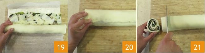 Rollen Sie den doppelten Teig von der längeren Seite her auf 19 und drücken Sie sanft, um die Naht zu verschließen 20, dann entfernen Sie die Enden und schneiden Sie die Rolle in 3 cm dicke Scheiben 21.