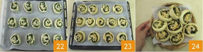 Legen Sie die Scheiben auf ein mit Backpapier ausgelegtes Backblech und dekorieren Sie sie mit den beiseite gelegten Mandeln 22, dann backen Sie sie in einem vorgeheizten statischen Ofen bei 180° etwa 25 Minuten lang, stellen Sie das Blech auf die mittlere Schiene. Sobald sie goldbraun sind, nehmen Sie sie heraus 23 und servieren Sie Ihre gefüllten Rolls mit Grana Padano und Gemüse noch heiß 24!
