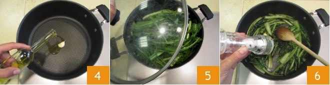 In einer Pfanne braten Sie eine ungeschälte Knoblauchzehe in etwas Öl an 4, dann fügen Sie den Löwenzahn hinzu, decken Sie die Pfanne mit einem Deckel ab 5 und kochen Sie bei mittlerer Hitze für 8 Minuten. Würzen Sie den Löwenzahn mit Salz 6 und Pfeffer und lassen Sie ihn abkühlen.