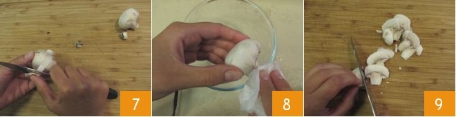 Nun kümmern Sie sich um die Champignons: Entfernen Sie mit einem kleinen Messer das Ende des Stiels und schälen Sie die Außenseite des Hutes 7, dann wischen Sie die Pilze vorsichtig mit einem angefeuchteten Küchentuch ab, um Erdreste zu entfernen 8 und schneiden Sie sie in dünne Scheiben 9.