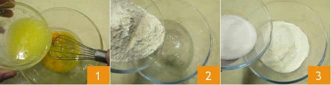 Um den romagnolischen Kranz zuzubereiten, schmelzen Sie zuerst die Butter im Wasserbad und lassen Sie sie abkühlen; sobald sie kalt ist, fügen Sie sie zu den Eiern hinzu und schlagen Sie sie leicht mit dem Schneebesen, um sie zu vermischen 1. In einer anderen Schüssel geben Sie das gesiebte Mehl 2, den Zucker 3,