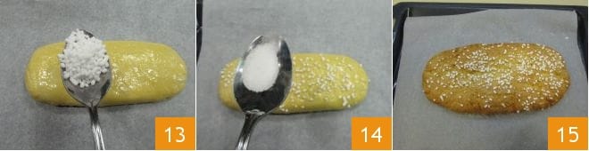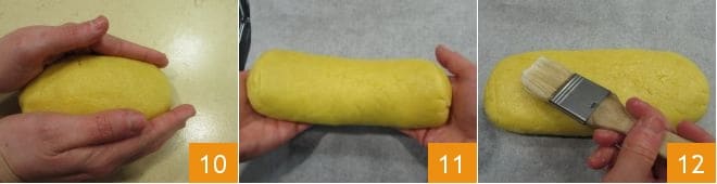 Sobald Sie einen homogenen und kompakten Teig haben, formen Sie ihn zu einem Laib 10, legen Sie ihn auf ein Backblech 11 und drücken Sie ihn leicht mit den Handflächen flach, dann bestreichen Sie die Oberfläche mit Milch 12.
