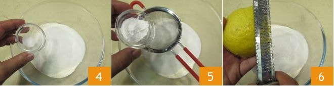 das Salz 4 und das gesiebte Backpulver 5. Aromatisieren Sie mit Zitronenschale, wobei Sie darauf achten, nur den gelben Teil zu reiben und nicht den weißen, der bitter wäre 6.
