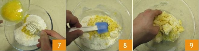 Gießen Sie nun die Mischung aus Eiern und geschmolzener Butter in die Schüssel mit den trockenen Zutaten 7 und mischen Sie mit einem Spatel, um die Zutaten zu sammeln 8. Dann übertragen Sie den Teig auf die Arbeitsfläche und kneten Sie ihn von Hand weiter 9.