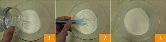 Um den römischen gebratenen Kabeljau (im Teigmantel) zuzubereiten, beginnen Sie mit dem Teig. Geben Sie das Mehl in eine Schüssel und dann das gut gekühlte Sprudelwasser 1 hinzu, rühren Sie gut mit einem Schneebesen 2, um einen glatten Teig ohne Klumpen zu erhalten 3.
