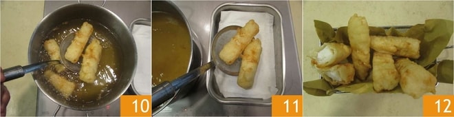 und tauchen Sie jeweils nur wenige Stücke auf einmal in das Öl: Sie sollten bei einer Temperatur von 180°C-190°C braten (der einzige Weg, um sicherzustellen, dass die Temperatur genau ist, besteht darin, ein Küchenthermometer zu verwenden) 10. Nach 7-8 Minuten sind die Filets goldbraun, heben Sie sie auf Küchenpapier ab 11 und fahren Sie mit dem Braten der übrigen fort. Nach dem Braten salzen Sie und genießen Sie Ihren römischen gebratenen Kabeljau (im Teigmantel) noch heiß 12.