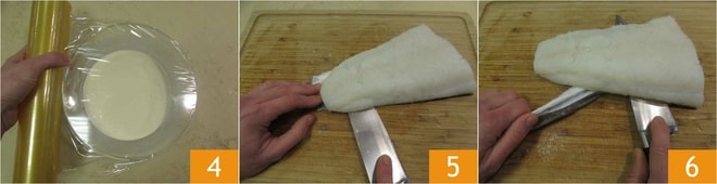 Decken Sie den Teig mit Frischhaltefolie ab und lassen Sie ihn eine Stunde im Kühlschrank ruhen 4. Nach dieser Zeit erhitzen Sie reichlich Pflanzenöl und kümmern sich unterdessen um den Kabeljau. Unser Kabeljau ist bereits entsalzt, daher können Sie ihn einfach mehrmals abspülen, ohne dass ein Einweichen erforderlich ist, oder Sie können ihn selbst mit unserer Küchenschule entsalzen: Wie man Kabeljau entsalzt. Halten Sie das Stück an der Schwanzseite und entfernen Sie die Haut 5, indem Sie sie mit den Händen abziehen 6.