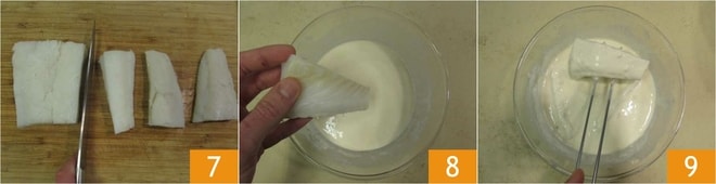 Dann schneiden Sie es in kleinere Stücke, insgesamt sollten es 6 Stück sein 7, und tauchen Sie sie nacheinander in den Teig 8. Heben Sie sie mit einer Zange oder Gabel heraus,