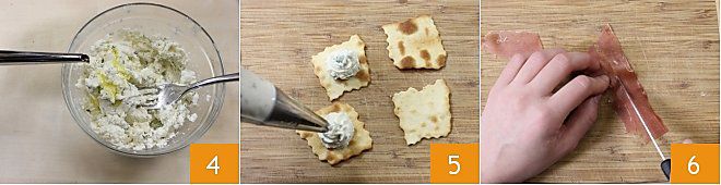 Mischen Sie gut, um alle Zutaten zu verbinden, fügen Sie einen Schuss natives Olivenöl extra hinzu, um den Käse weicher zu machen 4, dann salzen und pfeffern Sie nach Belieben. Dann füllen Sie die Mischung in einen Spritzbeutel mit Sterntülle und drücken Sie einen Klecks Ziegenkäsecreme auf jedes Blätterteigstück 5. Schneiden Sie dann die Schinkenscheiben in etwa 1 cm breite Streifen 6