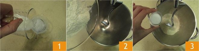 Um die Focaccine zuzubereiten, zuerst Wasser und Milch zusammenmischen 1. Gebt dann Mehl 2 und Zucker 3 in die Schüssel einer Küchenmaschine.