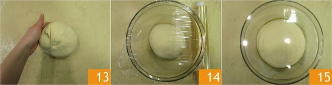 rundet den Teig 13 und legt ihn in eine zuvor eingefettete Schüssel. Dann mit Frischhaltefolie abdecken 14. Lasst den Teig gehen, bis er sich verdoppelt hat; das dauert etwa 2 Stunden 15.