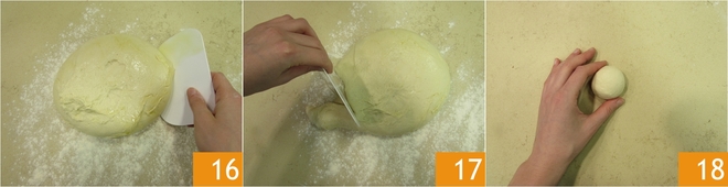 Wenn der Teig fertig ist, auf eine bemehlte Fläche geben 16. Mit dem Teigschaber Stücke von 50 g abstechen 17 und mit der Waage abwiegen. Formt die Teigkugeln 18,