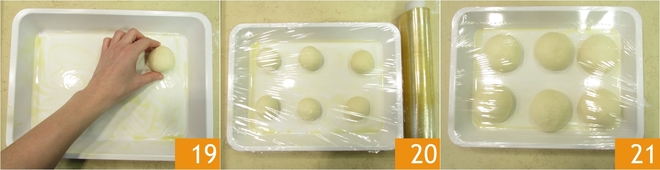 legt sie auf ein eingefettetes Blech 19, deckt sie mit Folie ab 20 und lasst sie 20 Minuten gehen 21.