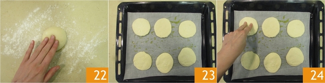 Nach der Ruhezeit die Arbeitsfläche erneut bemehlen und die Kugeln zuerst mit den Händen flachdrücken 22, dann mit dem Nudelholz zu Scheiben von ca. 9 cm Durchmesser und etwa 1 cm Dicke ausrollen. Legt ein Backblech mit Backpapier aus und bestreicht den Boden leicht mit Öl. Platziert 6 Focaccine pro Blech 23 und drückt mit leicht geölten Fingern in die Mitte jeder Focaccina vier Mulden 24.