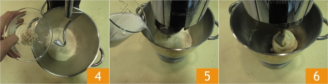 und die zerbröselte Hefe 4. Fangt an, mit dem Knethaken bei mittlerer bis niedriger Geschwindigkeit zu kneten und gebt die Flüssigkeiten nach und nach dazu 5. Knetet weiterhin bei niedriger Geschwindigkeit 6.