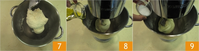 bis der Teig glatt und homogen ist 7. Gebt das Öl in einem dünnen Strahl dazu 8, bis es vollständig aufgenommen ist. Zum Schluss das Salz hinzufügen 9.