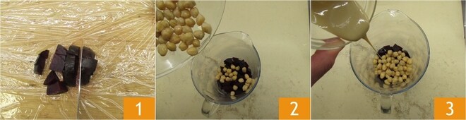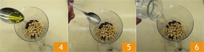 Um das Rote-Bete-Hummus zuzubereiten, ziehen Sie zuerst Handschuhe an und wickeln Sie ein Schneidebrett in Frischhaltefolie ein. Die Rote Bete neigt dazu, stark zu färben, daher ist es ratsam, vorsichtig zu sein. Schneiden Sie sie dann in Würfel 1 und geben Sie sie in einen hohen und schmalen Behälter. Fügen Sie auch die abgetropften Kichererbsen 2 und das Tahini 3 hinzu.