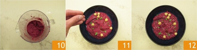 Sie sollten eine glatte, cremige und dichte Konsistenz erhalten 10. Übertragen Sie es nun in eine kleine Schüssel, dekorieren Sie es mit vorgekochten Kichererbsen und Sesamsamen 11. Das Rote-Bete-Hummus ist servierbereit 12.