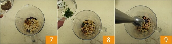 Fügen Sie auch die gemahlenen Gewürze hinzu: Kreuzkümmel, Paprika und Chili 7. Die zuvor gehackte Petersilie hinzufügen 8 und alles mit einem Stabmixer pürieren 9.