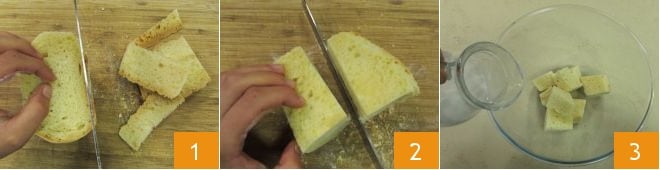 Um die Rote-Bete-Knödel zuzubereiten, beginnen Sie damit, die Kruste vom Brot zu entfernen 1, schneiden Sie es dann in Stücke 2 und geben Sie es in eine Schüssel. Gießen Sie die Milch dazu 3