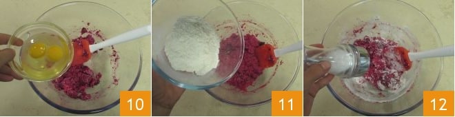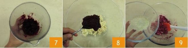 Sie sollten eine homogene Masse erhalten 7. Fügen Sie das pürierte Rote Bete dem Brot hinzu 8 und geben Sie dann nacheinander alle Zutaten hinzu, wobei Sie jedes Mal umrühren, um sie einzumischen: fügen Sie dann den geriebenen Käse hinzu 9,