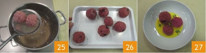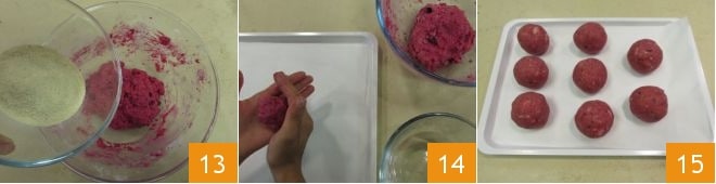 und schließlich die Semmelbrösel 13. Vermengen Sie die Mischung gründlich und formen Sie etwa 80 Gramm schwere Klöße 14. Während Sie die Klöße formen, legen Sie sie auf ein Tablett 15.