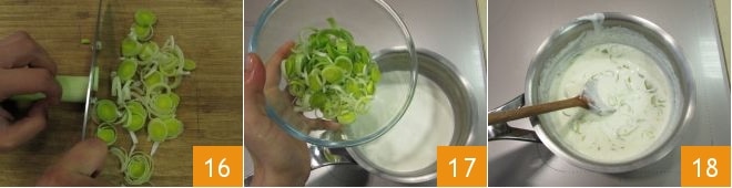Gehen Sie zur Zubereitung der Safransauce über: Entfernen Sie die Enden des Lauchs und schneiden Sie ihn in Scheiben 16, dann geben Sie die Sahne in einen kleinen Topf und fügen Sie die Lauchringe hinzu 17. Kochen Sie dies etwa 15-20 Minuten bei schwacher Hitze 18 und achten Sie darauf, dass die Sahne nicht überkocht.