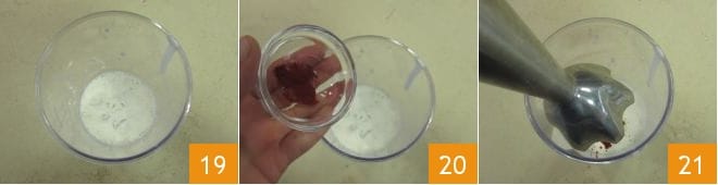 Geben Sie die Lauchsauce in das hohe Glas des Mixers 19, fügen Sie das Safranpulver hinzu 20 und pürieren Sie alles mit dem Stabmixer 21.