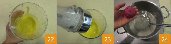 schöpfen Sie sie dann ab 25 und legen Sie sie auf ein Tablett 26. Servieren Sie Ihre Knödel auf einem Bett aus Lauch-Safran-Sauce und garnieren Sie sie mit Majoranblättchen 27.