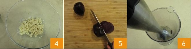 und lassen Sie es einweichen, indem Sie das Brot mit den Fingern zerbröseln 4. Schneiden Sie die Rote Bete in Stücke 5, geben Sie diese in ein hohes Glas und pürieren Sie sie mit einem Stabmixer 6.