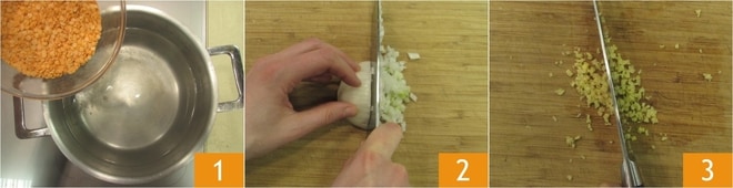 Um das rote Linsen-Dahl zuzubereiten, kochen Sie zuerst die Linsen in einem Topf mit reichlich Wasser für die auf der Packung angegebene Zeit 1. In der Zwischenzeit hacken Sie die Zwiebel 2 und den Ingwer 3 fein.