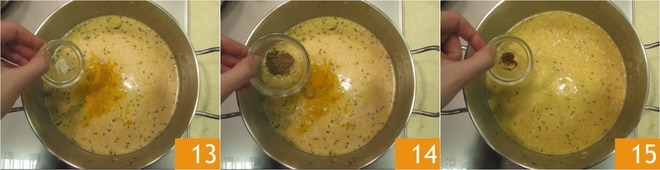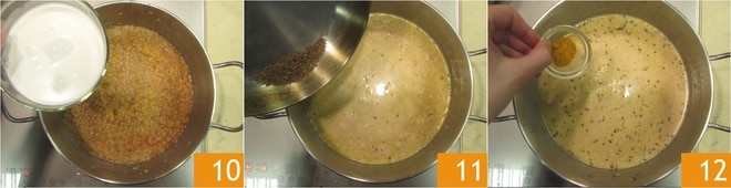 Fügen Sie auch die Kokosmilch 10 und die gerösteten Kreuzkümmelsamen 11 hinzu, dann mit Kurkuma 12 aromatisieren.
