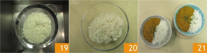 Sobald der Reis gekocht ist, abgießen 19 und in einer Schüssel beiseite stellen 20. Wenn die Linsen eine cremige Konsistenz erreicht haben, können Sie Ihr rotes Linsen-Dahl mit Basmati-Reis servieren 21!
