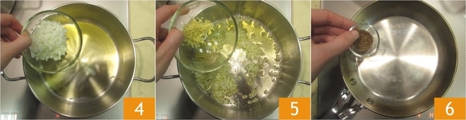 Erhitzen Sie einen Schuss Öl in einem Schmortopf, dann fügen Sie die Zwiebel 4 und den Ingwer 5 hinzu und lassen Sie sie sanft dünsten. In der Zwischenzeit rösten Sie die Kreuzkümmelsamen separat in einer Pfanne 6.