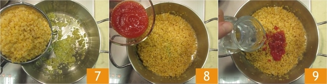 Nach der Garzeit die Linsen abgießen und in den Schmortopf geben 7. Die Tomatenpassata 8 und das Wasser 9 hinzufügen.