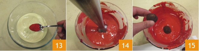 Fügen Sie der weißen Schokolade den Farbstoff hinzu 13, bis Sie eine schöne rote Farbe erhalten, dann mixen Sie mit einem Stabmixer, um die Masse glatt und glänzend zu machen 14. Nehmen Sie die Kugeln aus dem Kühlschrank und tauchen Sie 2-3 Kugeln gleichzeitig in die Masse 15, indem Sie sie drehen, um sie gleichmäßig zu bedecken.