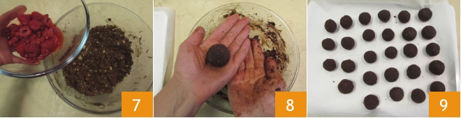 Fügen Sie die ganzen Himbeeren hinzu, die Sie zuvor gewaschen und getrocknet haben 7, und kneten Sie weiter, um eine kompakte Masse zu erhalten. Formen Sie Kugeln von etwa 20 g jede: Mit diesen Mengen erhalten Sie etwa 26 8. Legen Sie die Kugeln auf ein mit Backpapier ausgelegtes Tablett 9 und stellen Sie sie in den Kühlschrank.