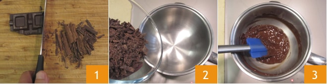 Um die roten Trüffel vorzubereiten, hacken Sie zuerst die Zartbitterschokolade 1, lassen Sie sie im Wasserbad schmelzen 2 3 und lassen Sie sie abkühlen.