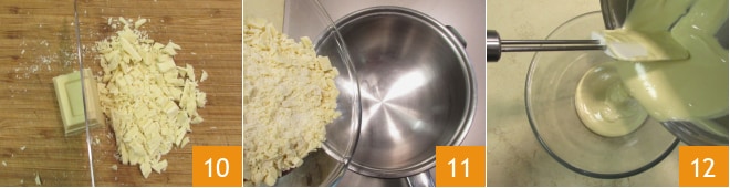 Jetzt hacken Sie die weiße Schokolade 10 und schmelzen sie im Wasserbad 11, dann geben Sie sie in eine Schüssel 12.